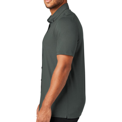 Combining the smart tailoring of a woven shirt with the movement and comfort of a soft knit, this shirt eases between night and day. The polished silhouette complements office wear, while the moisture-wicking fabric make it perfect for post-work play. A back yoke seam notched vent hem, and satin-finished buttons extend the contemporary profile.
